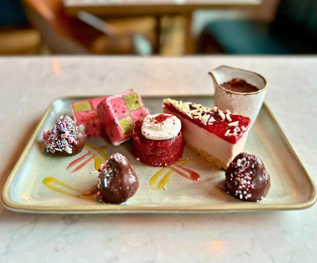 A shared platter of Valentine’s desserts, featuring indulgent bites such as red velvety cake and chocolate-coated strawberries, perfect for dipping, sharing and lingering over.